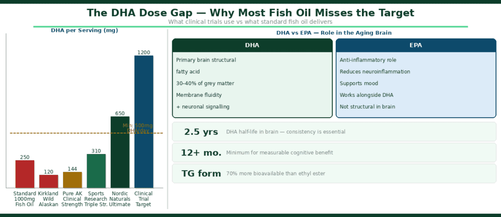 Why most fish oil misses the brain health target — DHA per serving across popular products vs what clinical trials actually use. Sources: Scientific Reports 2025, PMC, ScienceDirect 2025.